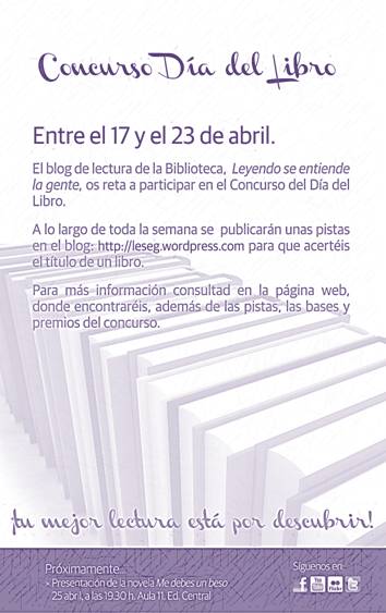 Como cada año, celebraremos el 23 de abril Día del Libro por todo lo alto. En esta ocasión hemos organizado un concurso en colaboración con Actividades Culturales. Se trata de descubrir el título de un libro y su autor a través de las pistas que os iremos dando a lo largo de la semana previa al 23 de abril.