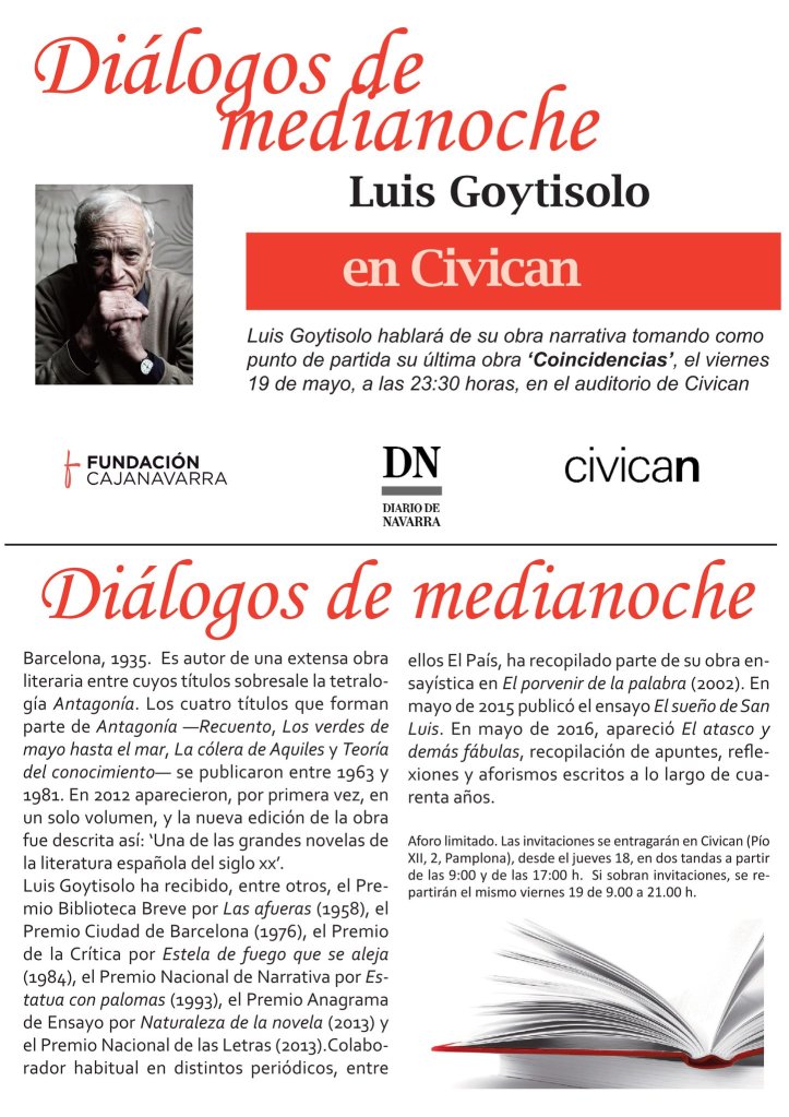 El viernes 19 de mayo el escritor Luis Goytisolo participará en una nueva sesión de Diálogos de Medianoche. Tendrá lugar a las 23:30 en el auditorio de Civican.