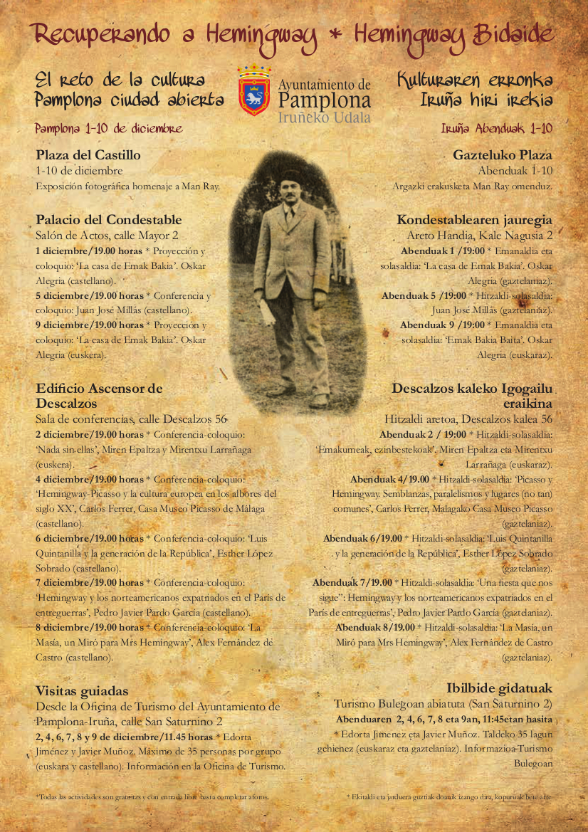 En la segunda edición «El reto de la cultura. Pamplona ciudad abierta» El Ayuntamiento de Pamplona del 1 al 10 de diciembre ha organizado una serie de actividades dentro del ciclo «Recuperando a Hemingway – Hemingway Bidaide».