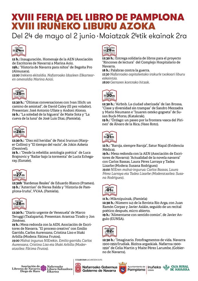 En esta decimoctava feria del Libro, una cita promovida por la Asociación de Librerías de Navarra Diego de Haro, son las doce librerías socias las que sacarán sus libros a la calle: Abarzuza, Arista, Chundarata, Elkar Comedias, Elkar Leire, Katakrak, Muga, Miriam, Nerea, Troa y Walden.