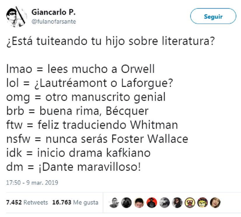 LESEG 25/09/2019 Caprichos y ocurrencias Chuleta de acrónimos Tanto por Whatsapp cómo por las redes sociales se usan mucho los acrónimos, el usuario de Twitter Giancarlo P. (@fulanofarsante) les ha buscado una descripción literaria. ¿Os gustan más estos significados o los originales? Compártelo Haz clic para imprimir (Se abre en una ventana nueva) Imprimir Más Haz clic para compartir en X (Se abre en una ventana nueva) X Haz clic para compartir en Facebook (Se abre en una ventana nueva) Facebook Haz clic para compartir en WhatsApp (Se abre en una ventana nueva) WhatsApp Haz clic para enviar un enlace por correo electrónico a un amigo (Se abre en una ventana nueva) Correo electrónico Me gusta Cargando... Relacionado