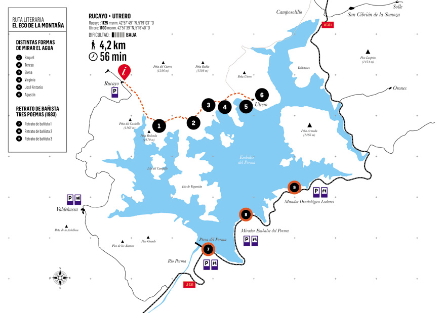 La primera ruta, basada en el libro Distintas formas de mirar el agua, la ruta va desde Rucayo hasta Utrero, a lo largo del camino se pueden encontrar 6 siluetas de acero, que representan a algunos de los personajes del libro, y con un QR que alberga un audio con un fragmento de la novela. [Reseña del libro]