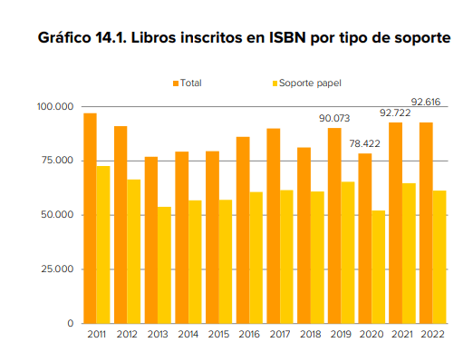 Según los datos de la Subdirección General de Promoción del Libro, la Lectura y las Letras Españolas, el número de libros inscritos en 2022 en el ISBN ha sido de 92.616, de los cuales un 66,2% son en soporte papel y el 33,8% restante en otros soportes.