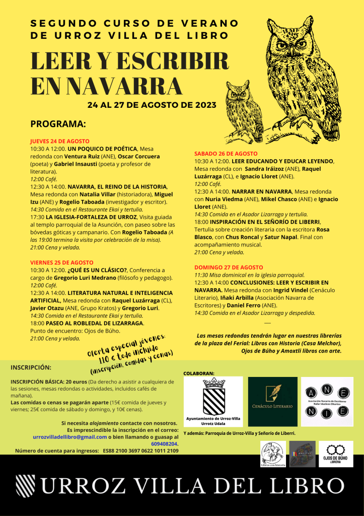 Del 24 al 27 de agosto de 2023 y bajo el lema «Leer y escribir en Navarra» Urroz-Villa vuelve a organizar un curso de verano en colaboración con la Asociación Navarra de Escritores y la Asociación Cenáculo Literario que gustará a cualquiera interesado en la literatura.