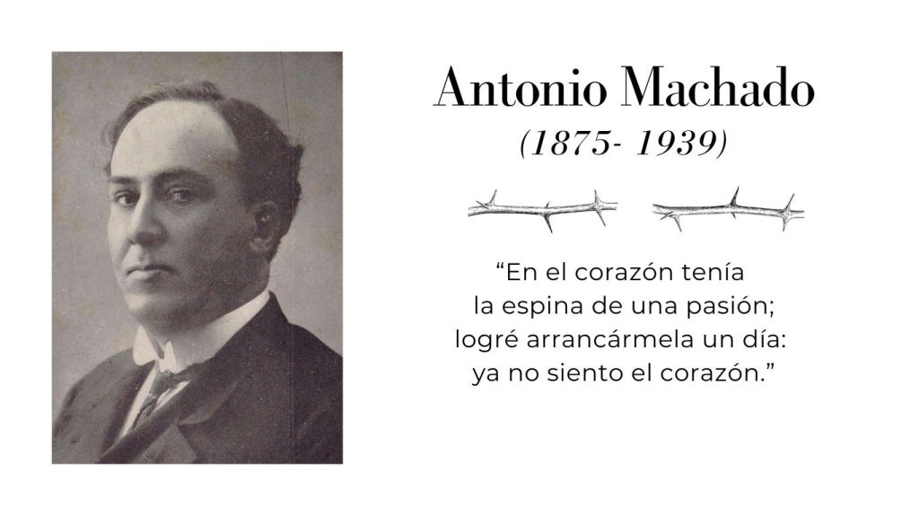 Nacido en Sevilla en 1875, Machado vivió allí hasta los ocho años, una etapa que dejó huella en su poesía. Tras mudarse a Madrid, se formó en contacto con representantes del panorama intelectual progresista. La complicada situación familiar tras la muerte de su padre y de su abuelo lo acercó al ambiente bohemio y cultural madrileño, donde entabló amistad con autores como Juan Ramón Jiménez y Rubén Darío.